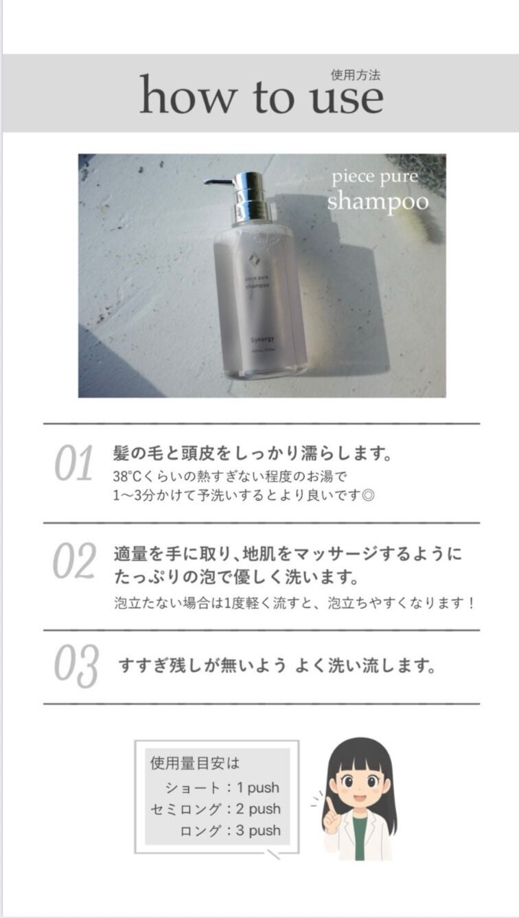 2~3プッシュを目安に頭皮、髪の毛先まで全体に泡立て2~3分放置後洗い流して下さい。